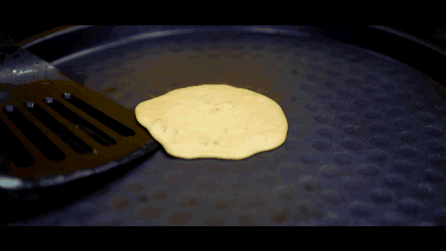 1、面糊摊入锅中,不要着急翻动,待面饼边缘微微翘起时,再用锅铲试着将其铲起。