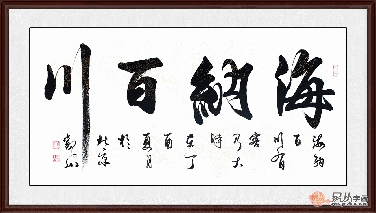海纳百川,出自晋朝袁宏《三国名臣序赞》:“形器不存,方寸海纳。”李周翰注:“方寸之心,如海之纳百川也,言其包含广也。”人们都把那些具有像大海一样广阔胸怀的人看做是可敬的人。观山老师这幅《海纳百川》作为商务礼品品位尽显,推荐选择。