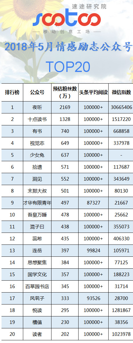 速途研究院以预估粉丝数为依据,综合头条平均阅读数以及微信指数(数据截止到5月9日),发布《2018年5月情感励志公众号排行榜TOP20》。 根据榜单数据显示,排行榜内85%的公众号头条阅读量都是100000+,用户对情感励志公众号的接受度普遍比较高,这也说明情感励志公众号推送内容是比较符合大众需求的。