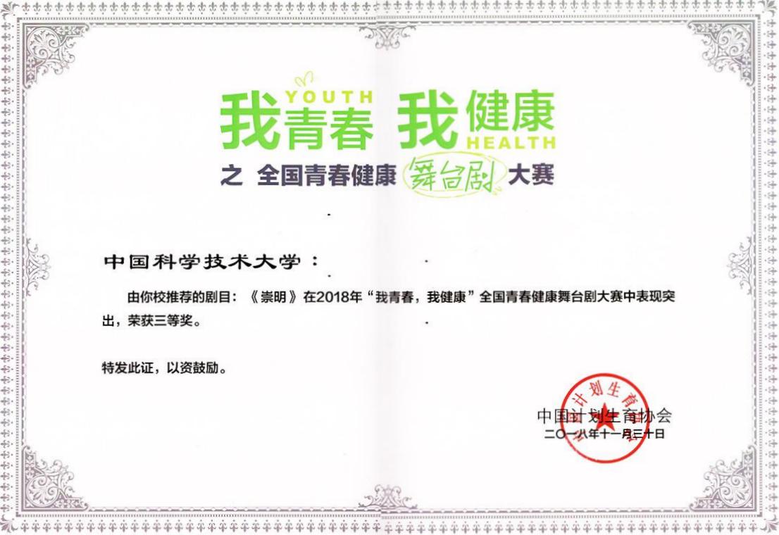 由安徽省计划生育协会选送,我校计生协组织拍摄,大学生青春健康自愿者自编、自导、自演的参赛剧目《崇明》获得了大赛三等奖。本剧主要以艾滋病人日常生活中遇到的障碍为切入点,通过舞台剧的形式,体现了艾滋病患者也有爱和被爱的权利这一主题,号召我们行动起来传递爱,关爱艾滋病病人。