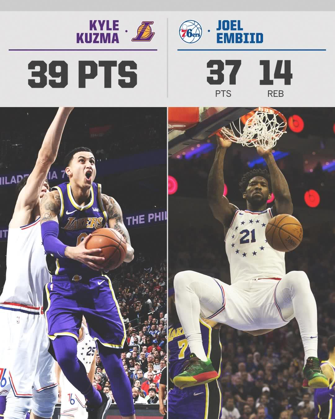 新京报讯(记者 徐邦印)2月11日,湖人客场120比143惨败于76人,身处交易流言中的湖人新星库兹马,打出了堪比超级巨星的表现,他出场32分钟,砍下39分、3个篮板球,整场的发挥甚至不逊于詹姆斯。