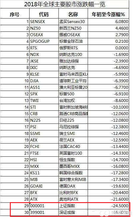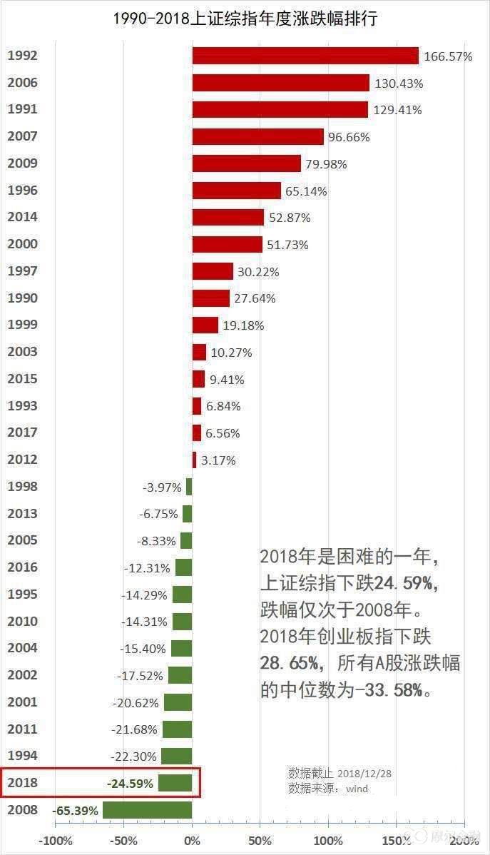 2018年的A股,沪指全年下跌24.59%;深成指下跌34.42%;创业板指下跌28.65%;中小板指下跌37.75%,熊冠全球(如上图)。纵观跌幅排名,行业惨状历历在目,跌幅超过30%的有14个一级行业,没有一个行业在今年取得正收益。上证指数今年跌幅为有史以来第二,仅次于2008年的跌幅。