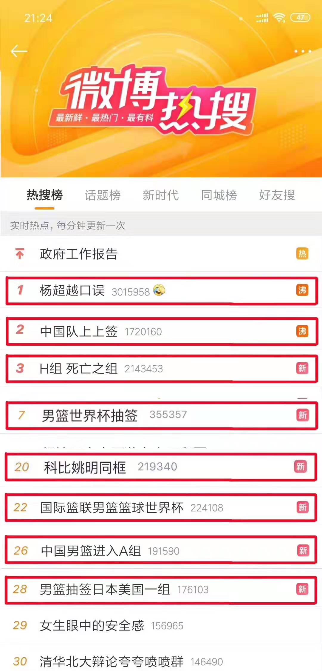 在抽签仪式的过程中,“杨超越口误”这个关键词已经登上了各大热搜的榜单,在微博热搜榜上,甚至一度排到了第二位,力压“男篮世界杯抽签”的热搜关键词,阅读超过4.2亿,评论数也接近6万条。