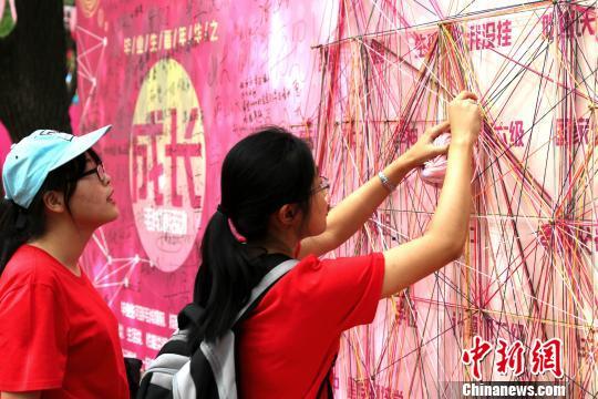 成长毛线墙前,通过工作人员的引导,毕业生们按照地点类、专业类、学习类、生活类、性格类等将自己的山大经历通过毛线连接起来,通过这个过程梳理自己的大学生涯,回忆起自已在山大生活的点点滴滴。 梁犇 摄